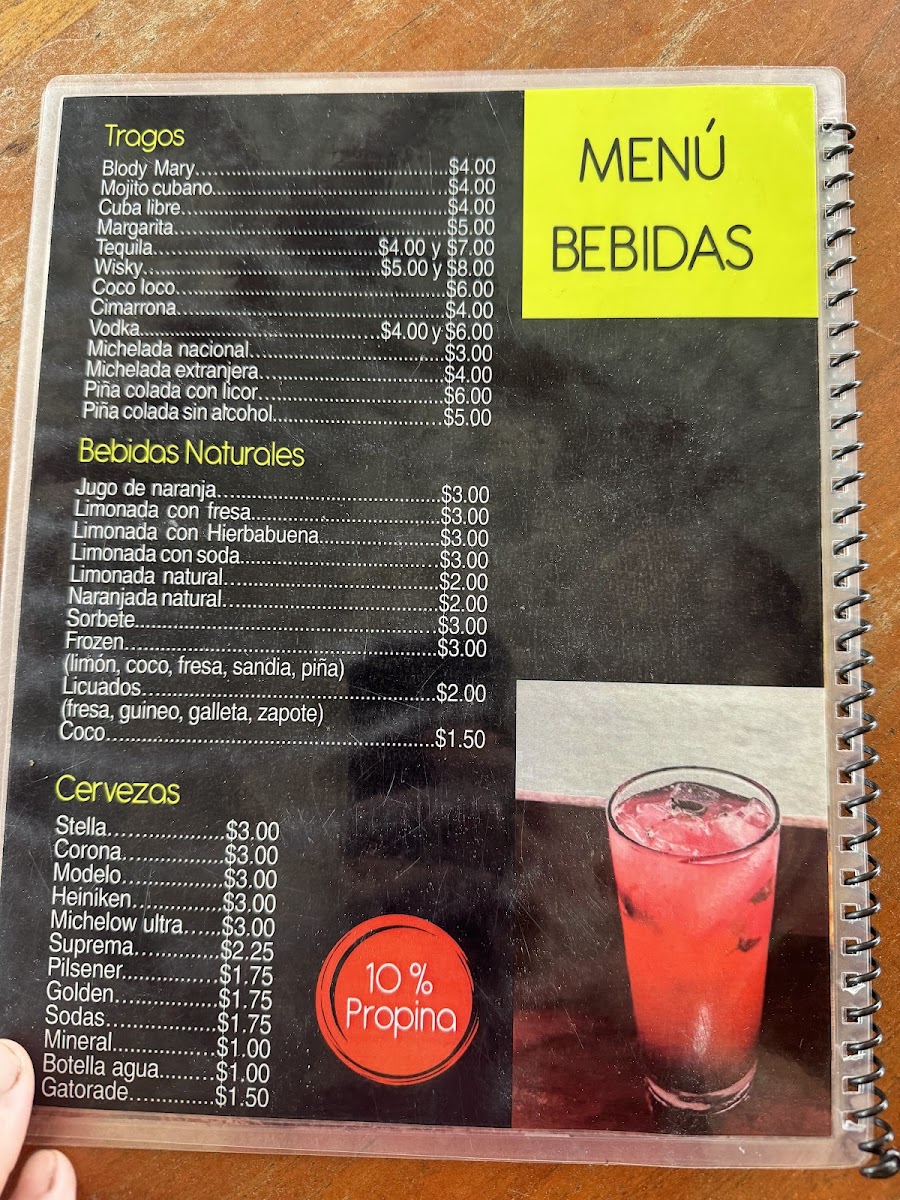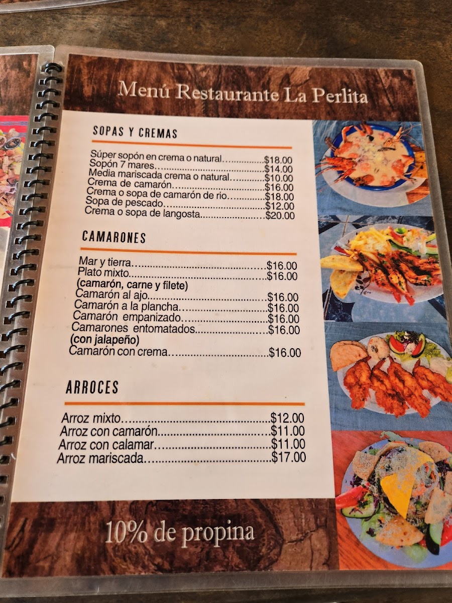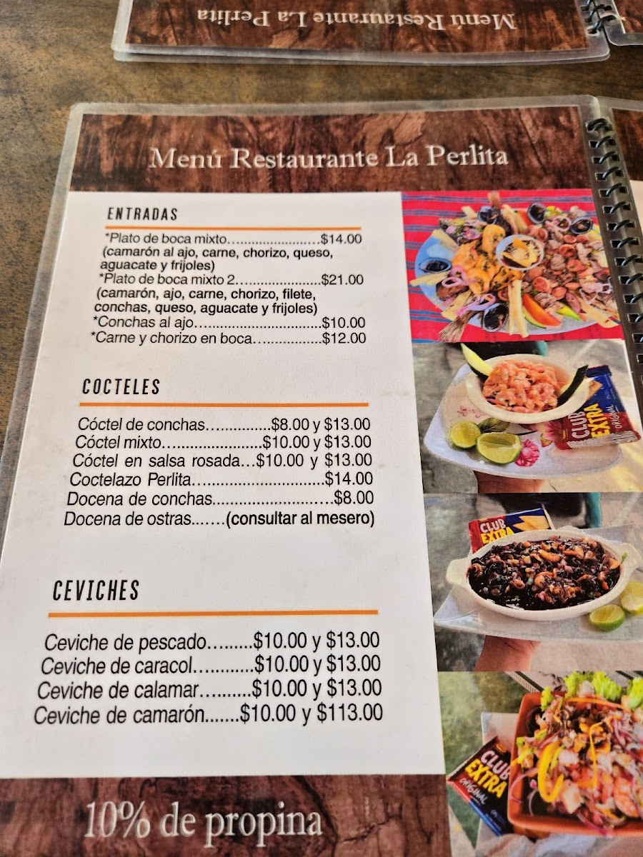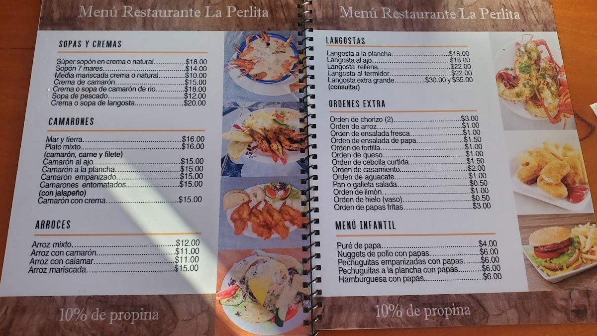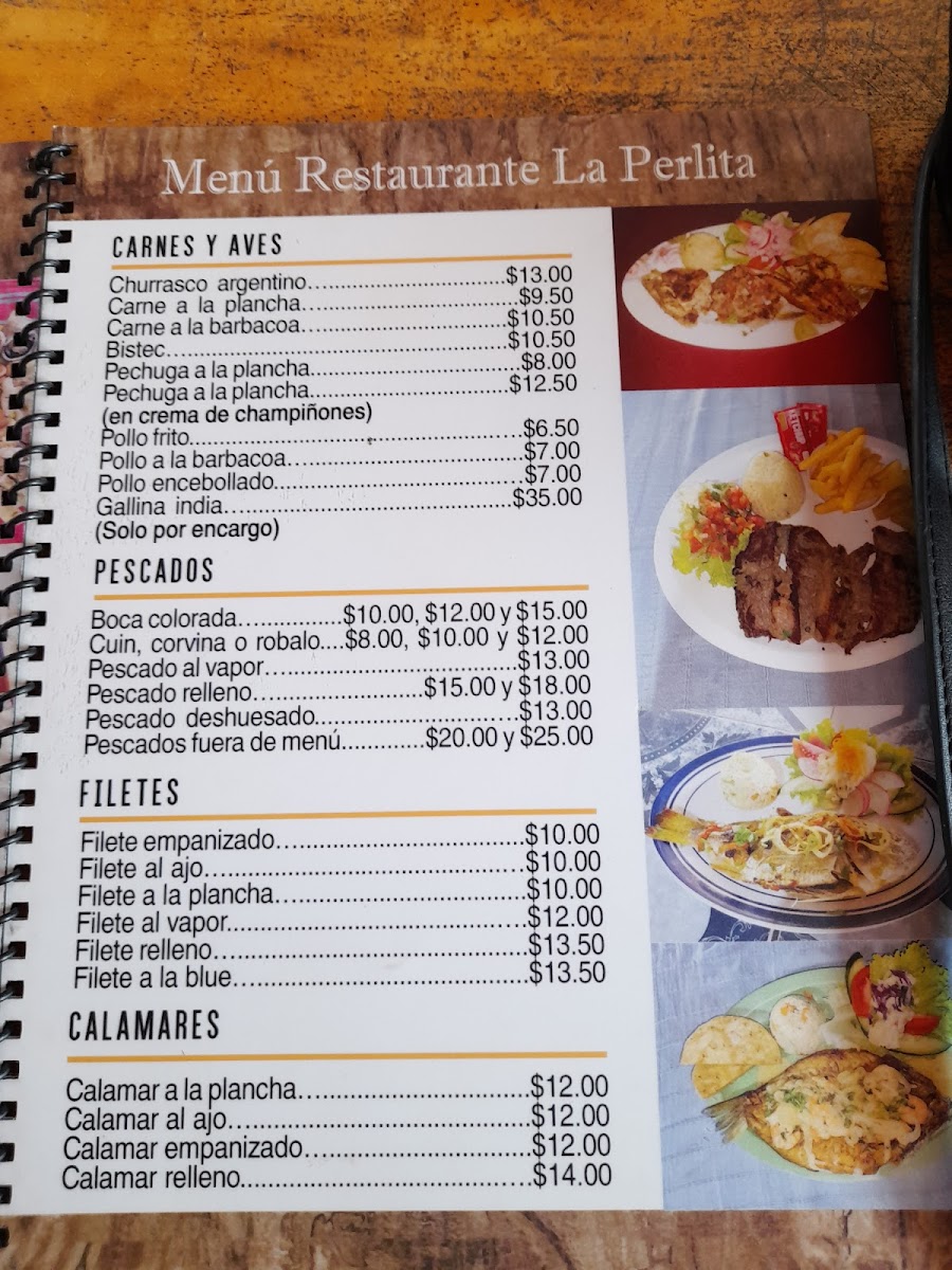 The menu at Restaurante La Perlita comes together as a rich, seafood-forward experience that highlights generous portions, classic coastal preparations, and refreshing drinks that balance the meal. Signature platters like Mariscada 7 Mares, Media Mariscada, and Mariscada En Crema showcase an abundant mix of seafood, offering variety and depth for diners who want to sample multiple flavors in one dish. Raw and citrus-marinated options such as Ceviche De Camarones and Ceviche de Camarón deliver freshness and brightness, while indulgent choices like Docena de Ostras and Michelada Y Ostras Frescas emphasize the restaurant’s connection to the sea. Fried and grilled fish dishes, including Corvina Frita, Pescado Frito Relleno de Camarones, Pescado Relleno de Camarones, and Pescado Boca Colorada, add comforting textures and bold seasoning, especially when paired with garlicky favorites like Filete Al Ajo and Camarones Al Ajillo. For heartier appetites, items such as Churrasco, Hamburger, and the indulgent Langosta Rellena broaden the menu beyond seafood without losing its identity. Creamy preparations like Crema de Mariscos provide warmth and balance, while drinks such as Naranjada Natural, Cóctel Perlita, and a cold Pilsener round out the experience with refreshing contrast. Overall, the menu feels cohesive and satisfying, built around well-known seafood classics, generous combinations, and simple beverages that complement rather than overpower the food.